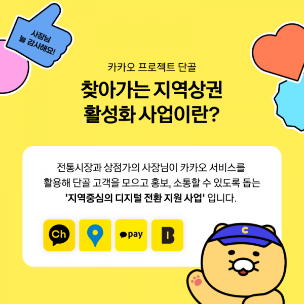 이번 사업은 카카오톡 채널과 카카오맵, 카카오스토어, 예약하기 등 다양한 디지털 서비스를 활용해 상인들이 단골 고객을 확보하고 소통을 강화할 수 있도록 돕는 사업이다.