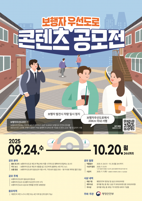 [금요저널] 행정안전부는 보행자우선도로에 대한 국민적 관심과 이해를 높이기 위해 9월 24일부터 10월 20일까지 ‘보행자우선도로 홍보 콘텐츠 대국민 공모전’을 개최한다.
