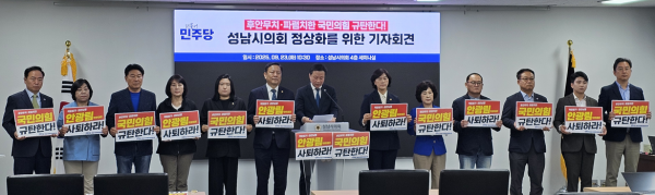 [금요저널] 성남시의회 더불어민주당협의회는 23일 기자회견을 통해 제305회 임시회 제2차 본회의에서 드러난 국민의힘의 반민주적이고 무책임한 의사 운영을 강력히 규탄했다.
