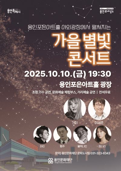 용인문화재단 관계자는 “이번 ‘가을 별빛 콘서트’는 새롭게 조성된 야외광장에서 열리는 첫 대규모 공연으로 시민들에게 열린 광장형 축제의 장을 제공하게 될 것”이라며 “많은 시민이 함께해 별빛 가득한 가을밤의 낭만을 즐기길 바란다”고 말했다.