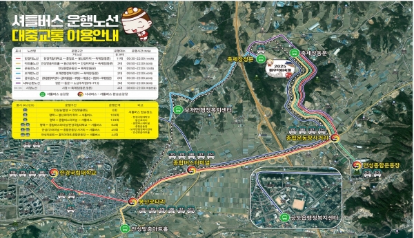 또한, 보개면 행정복지센터에서 축제장으로 가는 노선은 오전 9시 50분부터 오후 10시까지, 하루 40회가 운행되고 새롭게 도입된 공도읍 노선은 오전 9시 20분부터 오후 10시까지 하루 60회 운행되며 공도읍 행정복지센터와 금호어울림 아파트, 부영아파트, 대림동산 입구, 중앙대 등을 경유해 축제장에 도착한다.