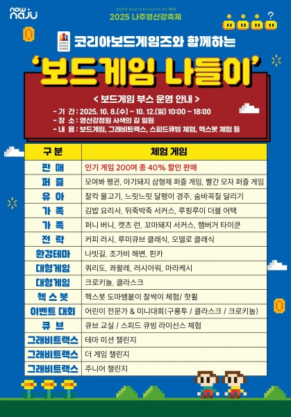 [금요저널] 전라남도 나주시가 오는 10월 8일부터 12일까지 열리는 ‘2025 나주영산강축제’에서 남녀노소 누구나 즐길 수 있는 ‘보드게임 나들이’를 운영한다.