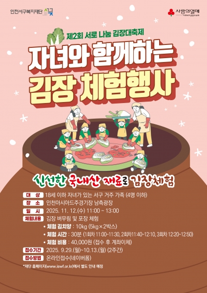 김장체험 프로그램 상세 내용 및 사전접수는 인천서구복지재단 홈페이지를 통해 확인 할 수 있으며 프로그램 신청은 이달 29일부터 다음달 13일까지 선착순으로 접수받는다.