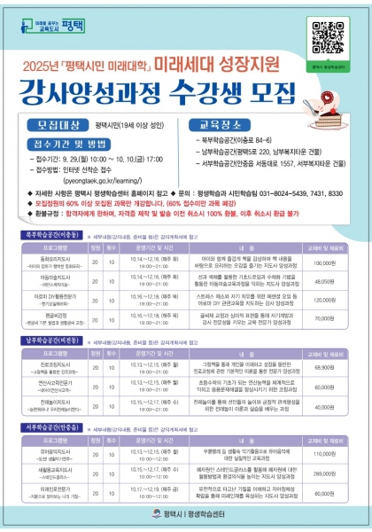 [금요저널] 평택시는 오는 10월 13일부터 12월 19일까지 10주간 ‘2025년 평택시민 미래대학’ 미래세대 성장지원 강사 양성 과정을 운영한다고 밝혔다.