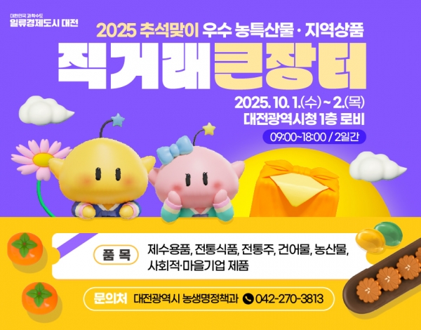 [금요저널] 대전시는 추석 명절을 맞아 10월 1일부터 2일까지 시청 1층 로비에서 ‘우수 농·특산물 및 지역상품 직거래 큰장터’를 운영한다.