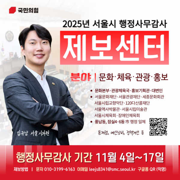 [금요저널] 김규남 서울시의원은 오는 11월 4일부터 17일까지 열리는 2025년도 서울시 행정사무감사를 앞두고 시민 참여를 위한 제보센터를 운영한다고 30일 밝혔다.