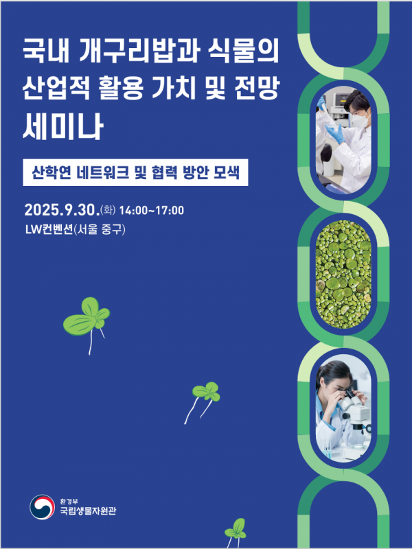 [금요저널] 환경부 소속 국립생물자원관은 9월 30일 오후 엘더블유컨벤션에서 ‘개구리밥과 식물의 산업적 활용 가치 및 전망’을 주제로 토론회를 개최한다고 밝혔다.