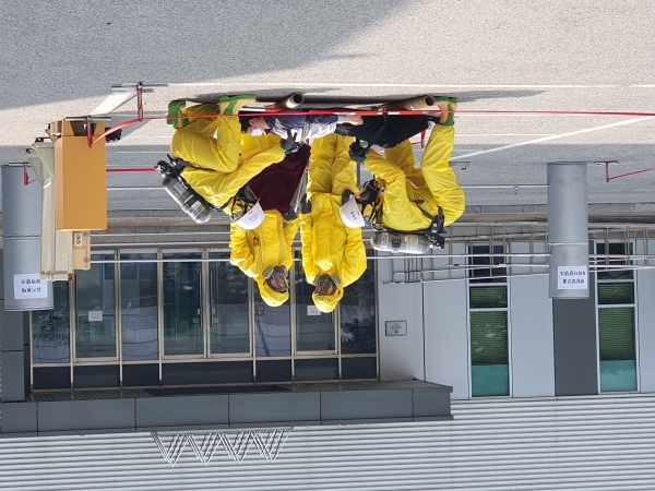 유해화학물질인 메틸 알코올 누출로 인한 화재 상황을 설정해 진행한 이 훈련은 자체 매뉴얼에 따라 △비상 상황 긴급전파 △소방대 초동 조치 △화재 진압 △인명구조 △사고 복구 등으로 구성됐다.