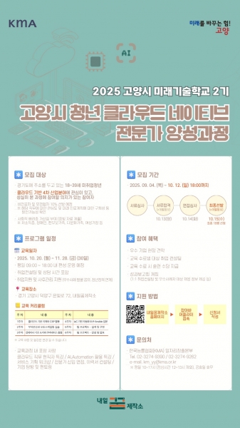 한편고양시는 오는 10월부터 ‘미래기술학교 2기 – 고양시 청년 클라우드 네이티브 전문가 양성과정’을 운영할 예정으로 9월 4일부터 10월 12일까지 잡아바 어플라이를 통해 교육생을 모집한다.