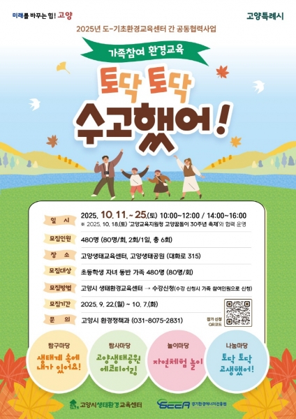 [금요저널] 고양특례시는 가족과 함께 참여하는 환경교육 프로그램‘토닥 토닥 수고했어’를 오는 11일부터 25일까지 매주 토요일 고양생태교육센터와 고양생태공원에서 운영한다고 밝혔다.