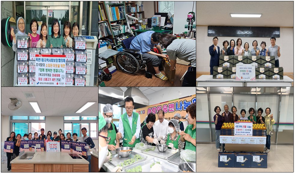 30일에는 옥련2동 지사협(위원장 박인규- 김영미) 위원들이 저소득 취약계층 30세대를 직접 방문해 갈비 선물 세트를 전달하며 건강과 안부를 챙겼다. 또 연수3동 지사협(위원장 김재식- 윤성연)은 저소득 어르신 및 장애인 110가구에 송편과 식혜를 나눴고, 송도2동 지사협(위원장 전미선- 정미숙)과 동춘3동 지사협(위원장 정진원- 황옥순)은 각각 저소득 취약계층 20가구에 선물 세트를 전달했다.