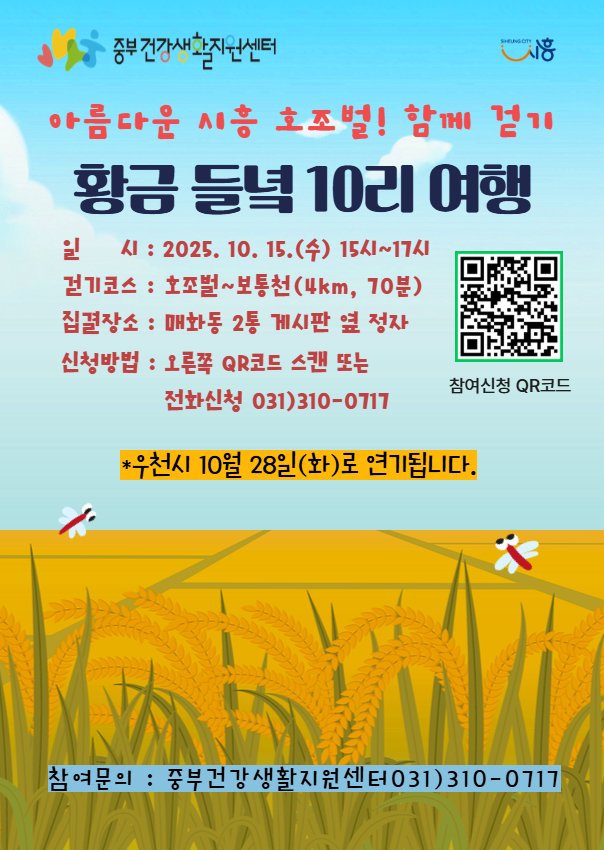 [금요저널] 시흥시(시장 임병택)는 오는 10월 15일 오후 3시부터 5시까지 호조벌 일대에서 ‘황금 들녘 10리 여행 걷기 행사’를 연다.
