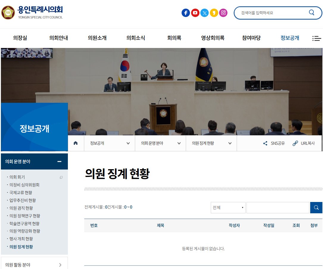 용인블루의 분석에 따르면, 용인시의회 홈페이지 ‘정보공개’ 메뉴는 ‘의회 운영’, ‘의원 활동’, ‘의회 사무’ 등 3개 분야 아래 총 27개의 하위 메뉴로 구성되어 있다. 그러나 이 중 무려 16개 메뉴가 “등록된 게시물이 없습니다”라는 안내 문구만 있을 뿐, 어떠한 정보도 담고 있지 않은 ‘빈 페이지’ 상태로 방치되고 있었다.