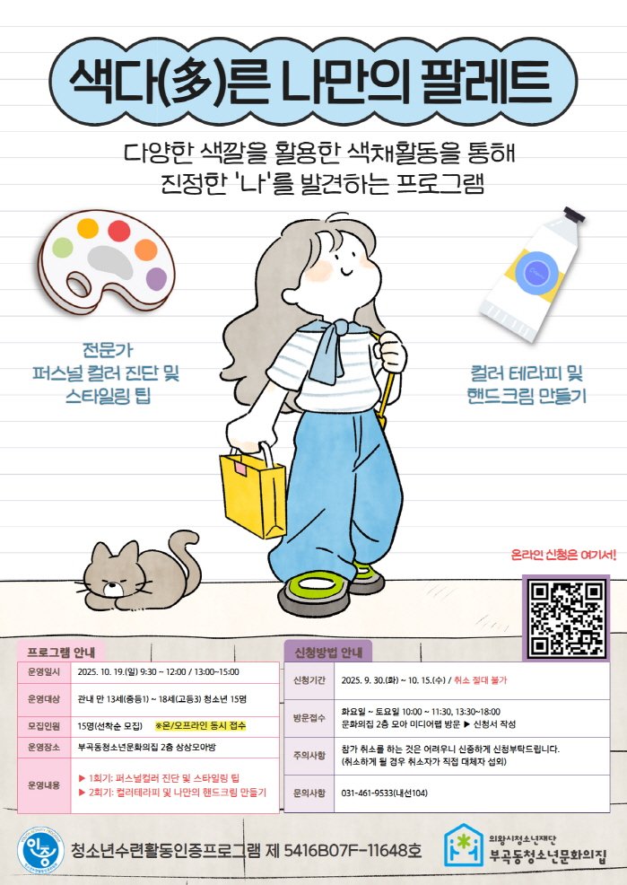 신청은 10월 15일(수)까지 가능하며, 프로그램 안내문의 큐알 코드 접속을 통해 온라인으로 하거나 부곡동청소년문화의집을 직접 방문해 오프라인으로 하면 된다.