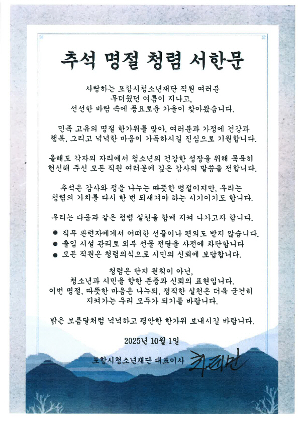 최제민 포항시청소년재단 대표이사는 서한문에서 “청렴은 단지 규범이 아니라 청소년과 시민에 대한 신뢰의 약속이자 존중의 표현”이라며, “이번 명절이 공직자의 청렴 의식을 되새기고, 투명한 행정을 실천하는 계기가 되길 바란다”고 전했다.
