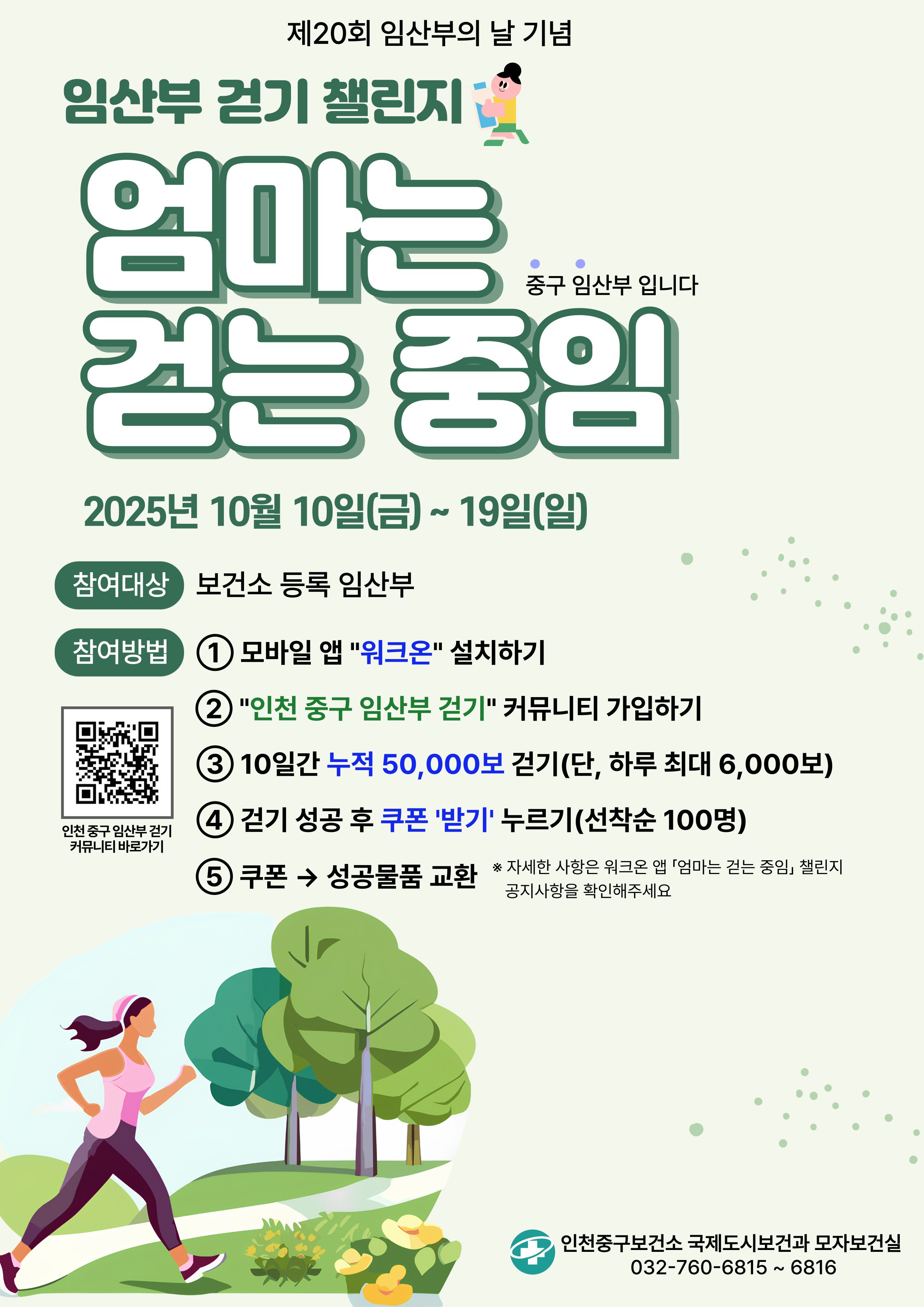 또한 임산부의 날인 10월 10일부터 오는 19일까지 10일간 관내 임산부들을 대상으로 임산부 걷기 챌린지 ‘엄마는 걷는 중(구)임(산부)’을 진행한다.