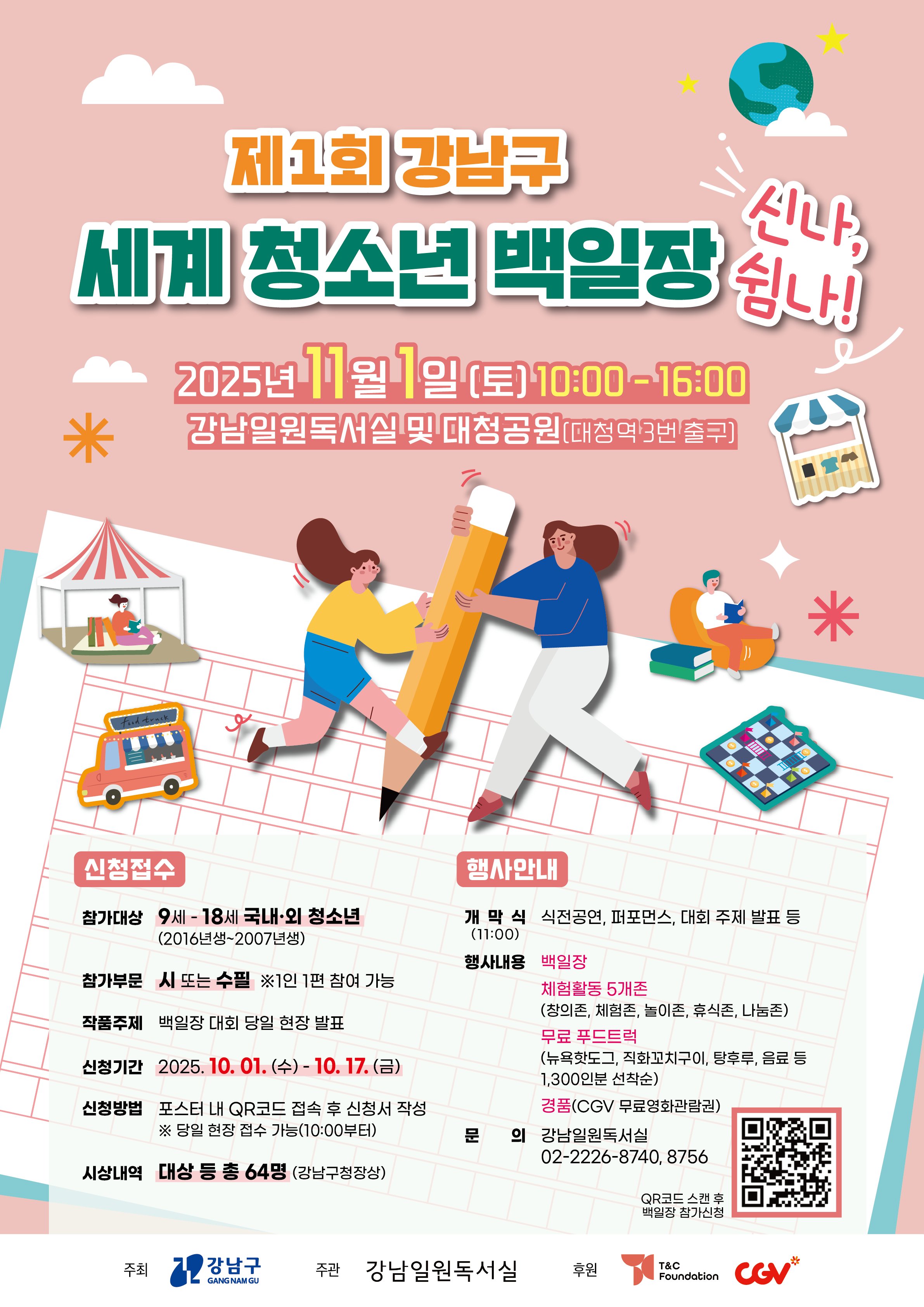 꿈이 모이는 도시, 미래를 그리는 강남구(구청장 조성명)가 오는 11월 1일 오전 10시부터 오후 4시까지 강남일원독서실과 대청공원 일대에서 ‘제1회 강남구 세계청소년백일장 신나, 쉼나!