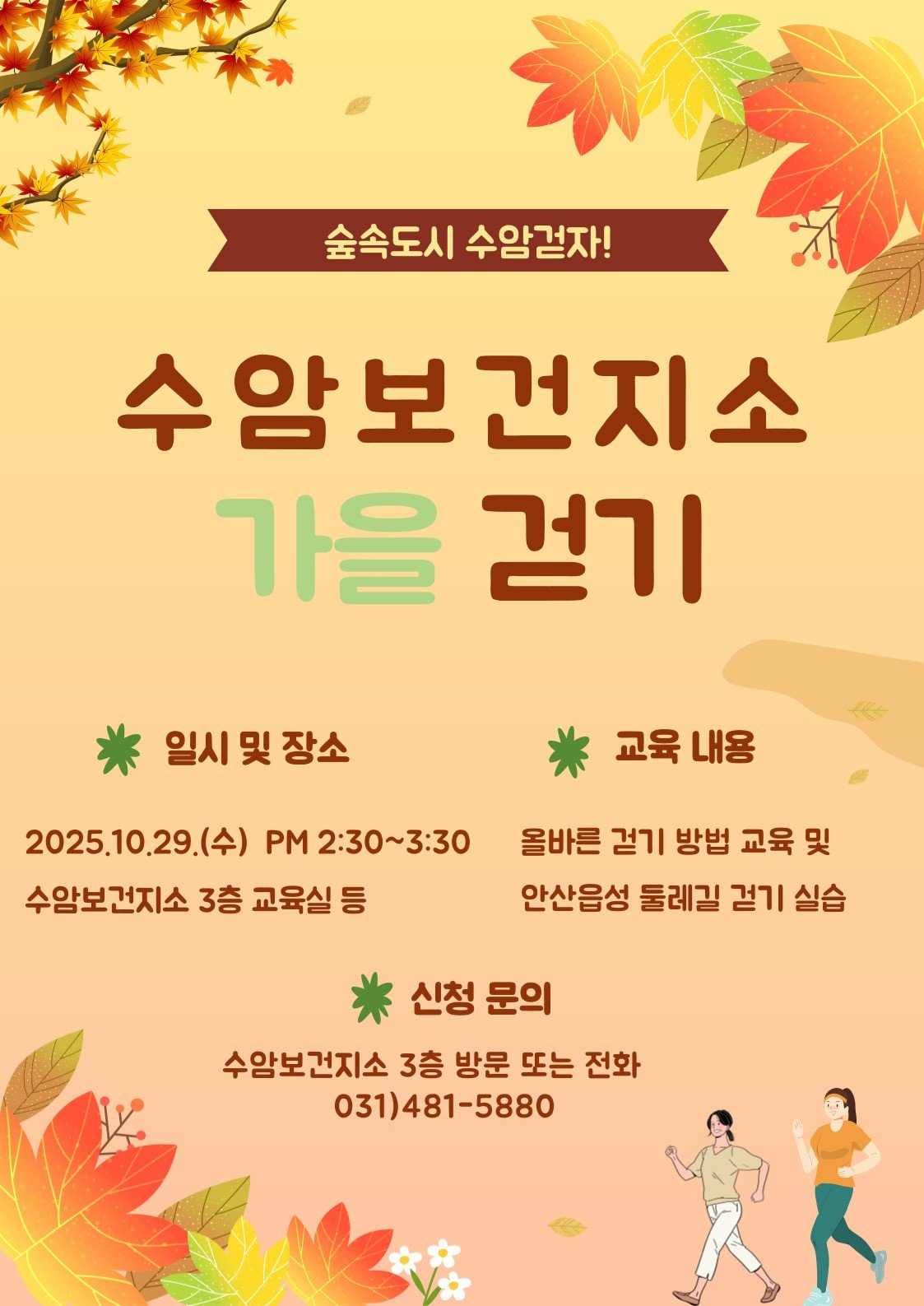 [금요저널] 안산시(시장 이민근) 상록수보건소 수암보건지소는 지역 주민의 건강증진을 도모하기 위해 ‘수암 가을 걷기 교실’ 참가자를 모집한다고 14일 밝혔다.