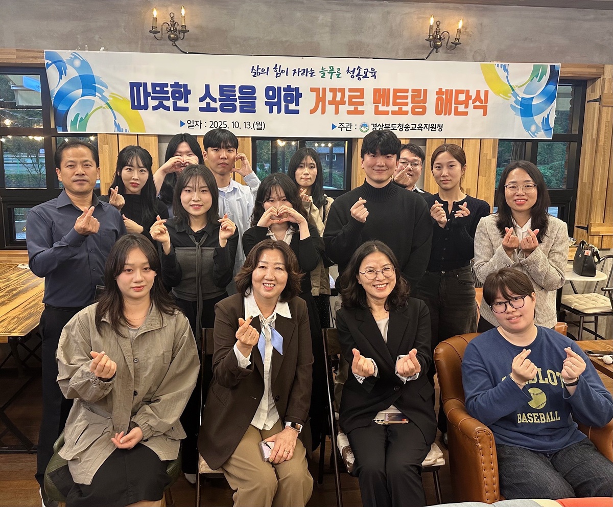 경상북도청송교육지원청(교육장 남정일)은 10월 13일(월) 관리자 멘티 3명(교육장 등) 및 2025년 신규, 저연차 공무원 멘토 15명(교사 7명, 일반직 8명)과‘거꾸로 멘토링 해단식’을 개최하였다.