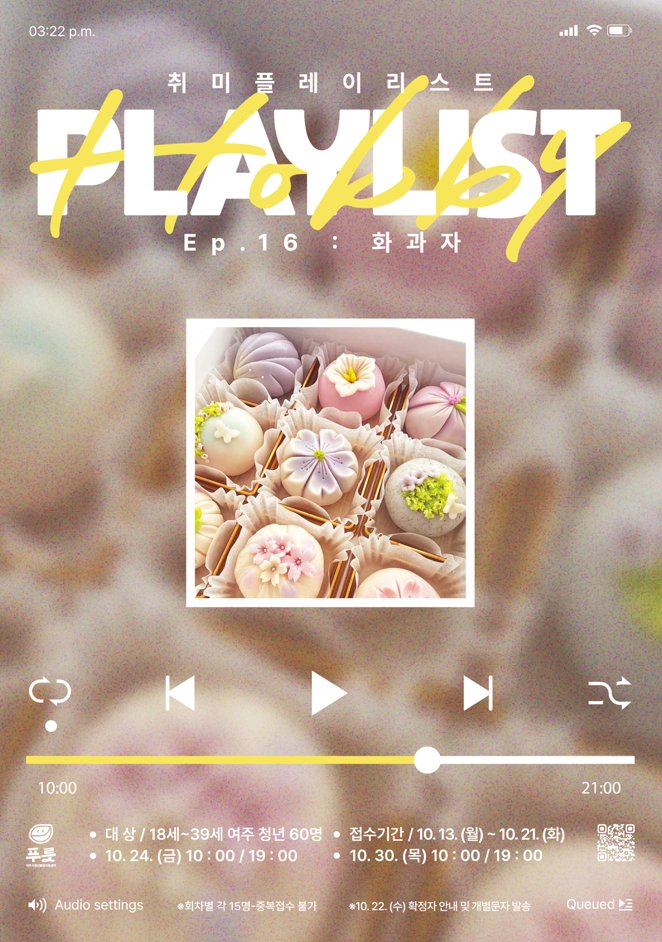 2023년도부터 시작되어 16편의 에피소드를 맞은 이번 ‘취미플레이리스트’에서는 가을을 맞아 △화과자를 주제로 간단한 이론 교육과 더불어 직접 화과자를 제작해 보는 컨텐츠로 10월 24일 10월 30일 양일간 각 30명의 여주시 청년(18세~39세)을 대상으로 한다.