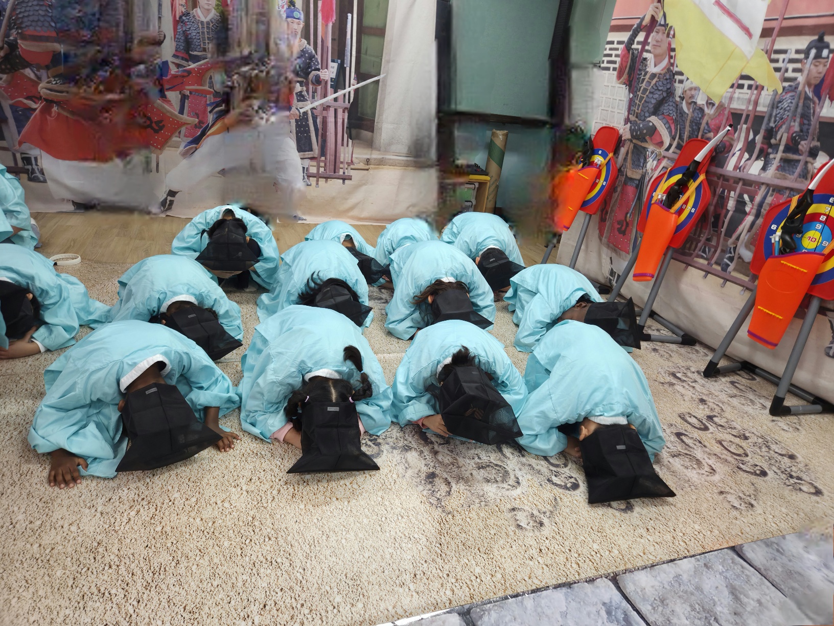 □ 유아들과 초등학교 1학년 학생들이 함께 옥색 두루마기와 유 건으로 단정히 차려입고 문과와 무과 시험에 참여하였다. 문 과 시험은 화선지에 붓으로 비오는 날을 주제로 시 쓰기와 그 림을 그려보고, 무과시험은 검술 대결, 활쏘기 대결, 기마 대 결을 하였는데 모두 진지하게 임해서 장원급제 어사화를 쓰고 기념사진을 남기기도 하였다. 유치원 채OO 유아는 “붓으로 글씨를 쓰는 것이 더 어렵지만 활쏘기, 말타기는 정말 재미있 었어요.라고 참여 소감을 말했다.