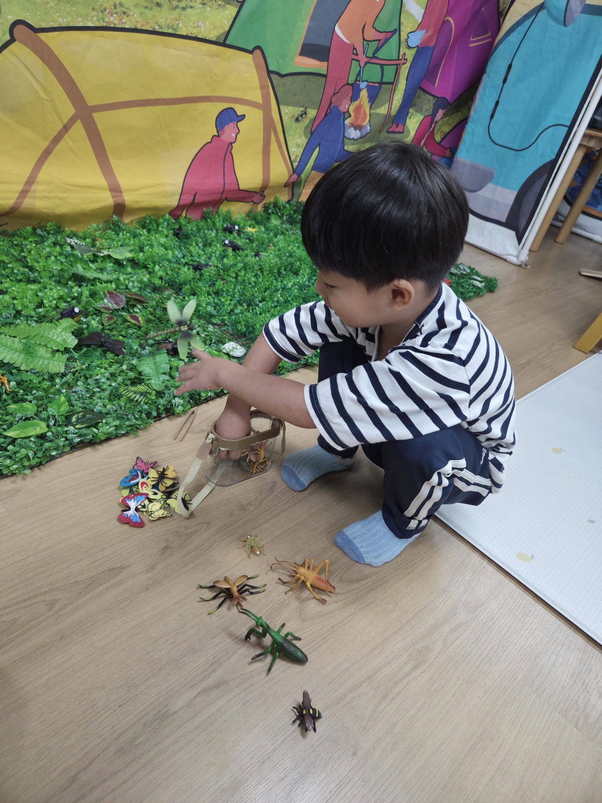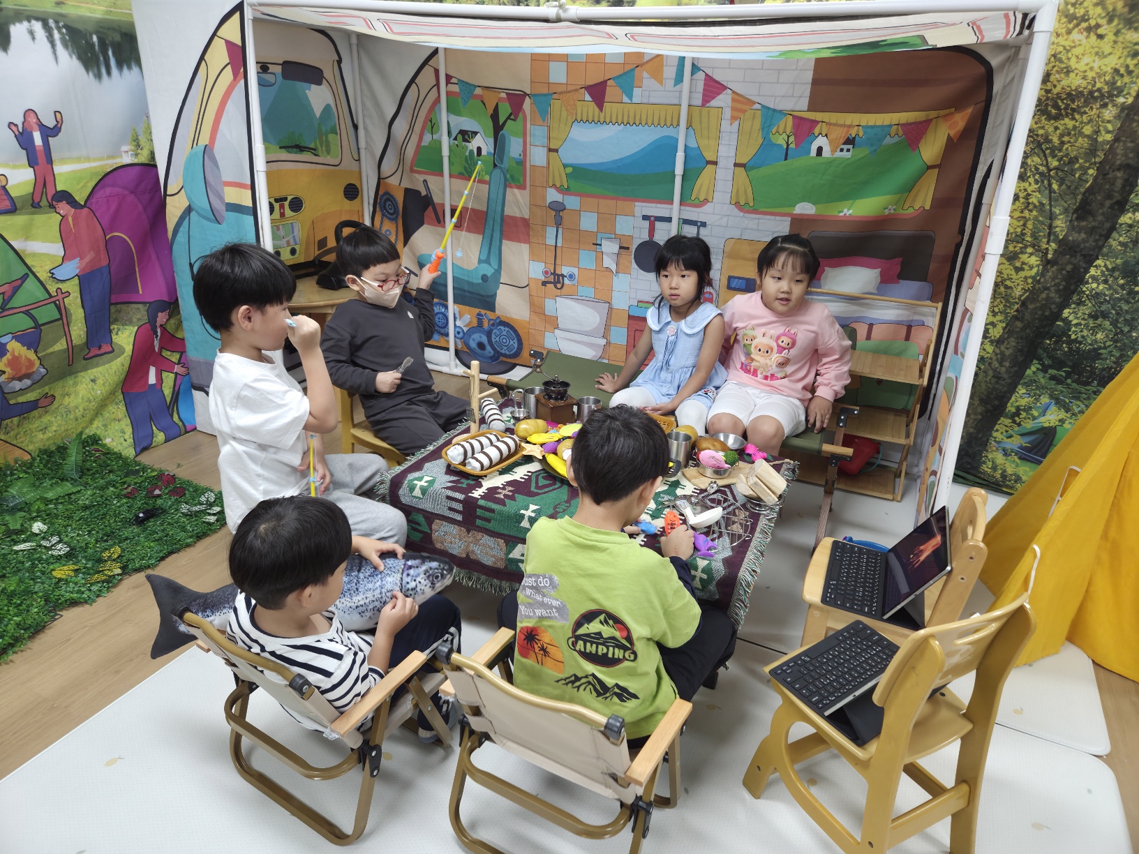 □ 체험존으로는 차박 캠핑존, 숲속 생태놀이존, 낚시놀이존, 바비큐 불 멍존, 텐트존 등 유아들이 흥미로워하는 테마로 차박 캠핑존에서 김밥, 샐러드, 어묵꼬치, 바비큐 고기구이 등 야외 요리 놀이를 해보고, 불멍 놀이에서는 불멍에 필요한 장작을 만들어 바비큐를 해보고, 숲속생태놀 존에서는‘최근 유아들이 흥미를 갖기 시작한 다양한 곤충과 나비를 찾아보고, 낚시 놀이로 잡은 물고기를 요리하는 소꿉놀이로 확장해가며 생태 감수성과 사회적 기술도 함께 배울 수 있었다.