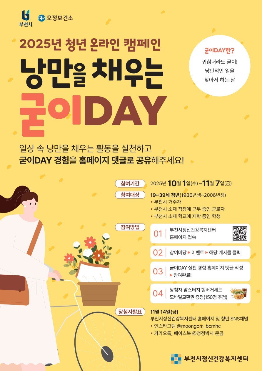 [금요저널] 부천시는 부천시정신건강복지센터와 함께 청년 정신건강 증진을 위한 온라인 캠페인 ‘낭만을 채우는 굳이DAY’를 11월 7일까지 진행한다.