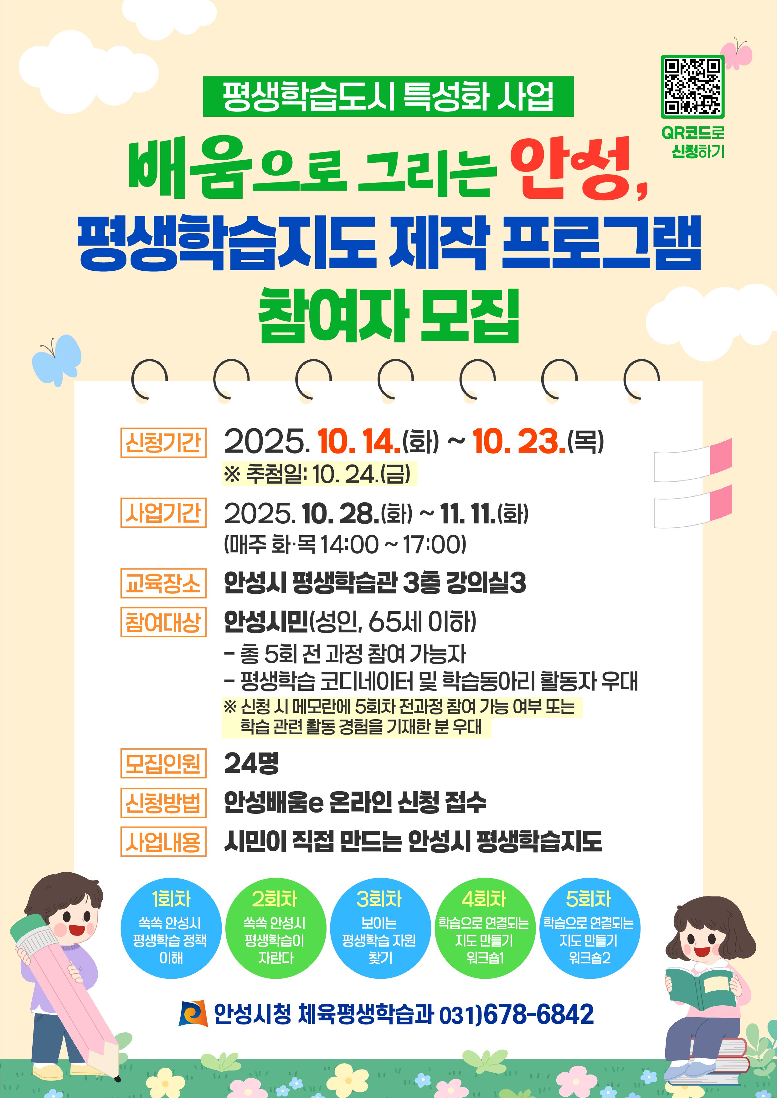 [금요저널] 안성시는 시민 주도형 평생학습 프로그램인 ‘배움으로 그리는 안성 – 평생학습지도 제작 프로그램’을 오는 10월 28일부터 11월 11일까지 매주 화- 목 오후 2시부터 오후 5시까지 안성시평생학습관에서 운영한다고 밝혔다.