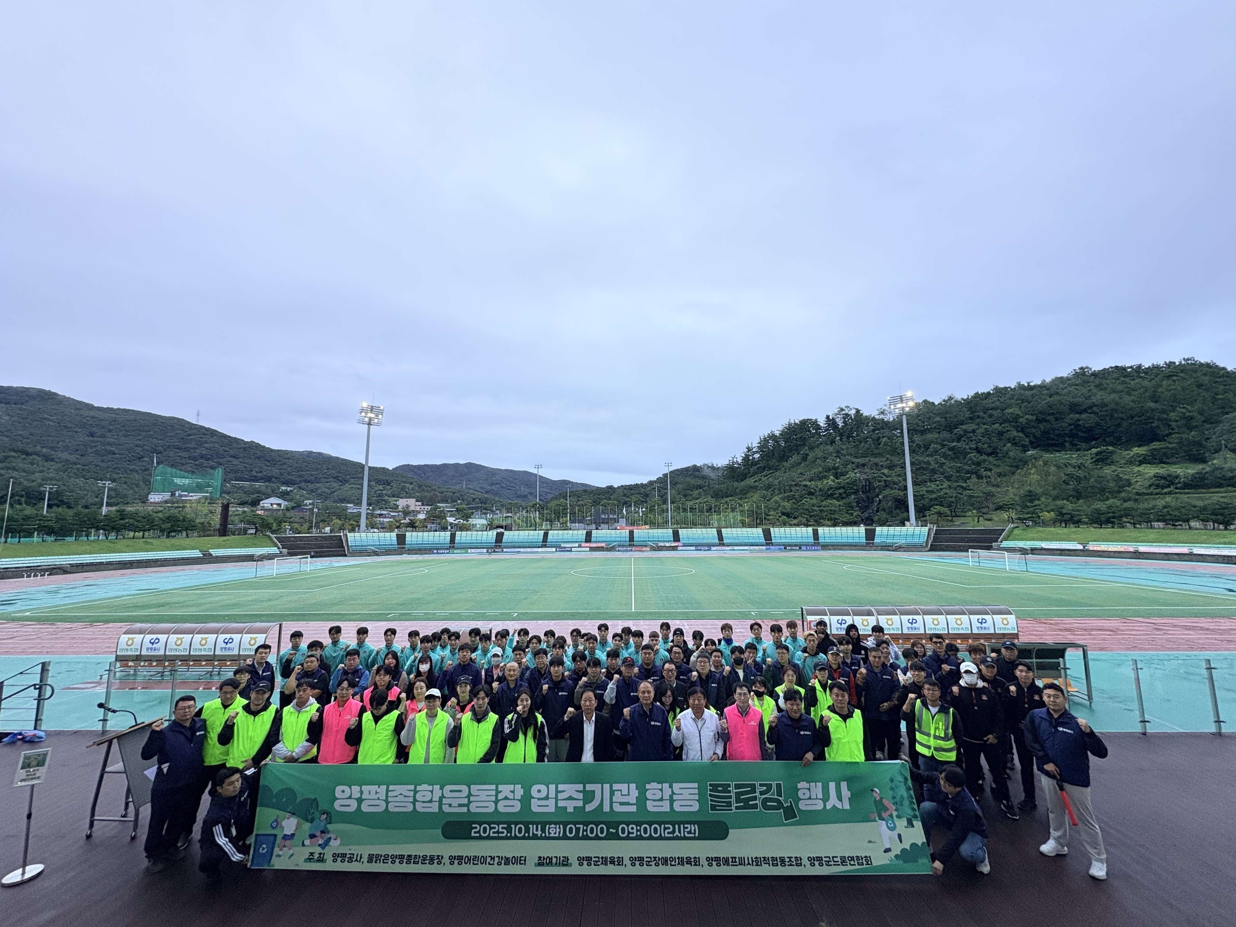 이번 행사는 양평공사의 ‘플로깅 챌린지 운영 계획’의 일환으로 마련됐으며 물맑은양평종합운동장에 입주한 양평군체육회, 양평군장애인체육회, 양평FC 사회적협동조합, 양평군드론연합회 등 관계자와 양평공사 임직원 및 가족 등 총 100여명이 참여했다.
