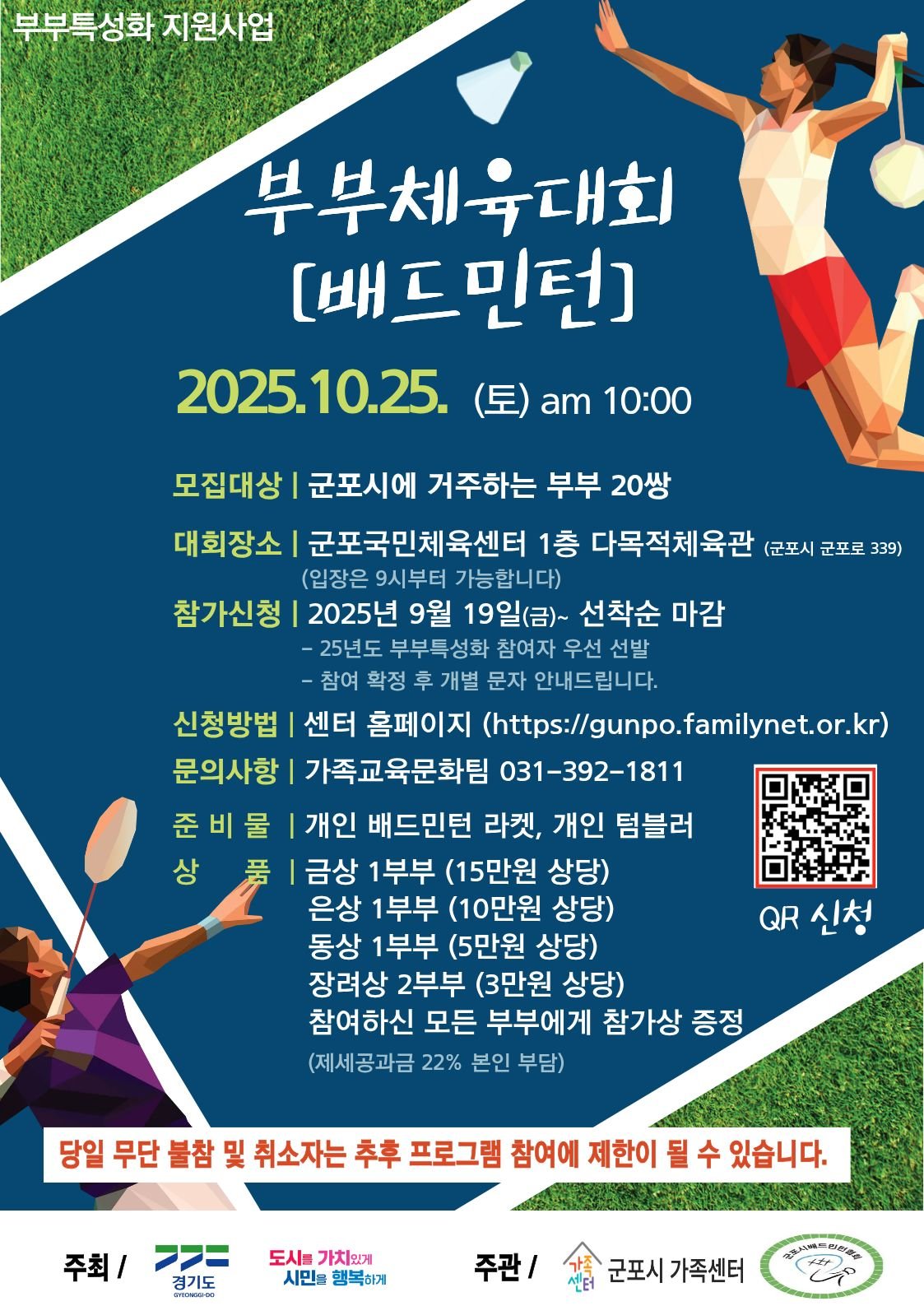 [금요저널] 군포시가족센터(센터장 박성희)는 오는 10월 25일(토) 10시부터 군포국민체육센터 1층 다목적체육관에서 부부특성화지원사업의 일환으로 부부체육대회 배드민턴을 개최한다.