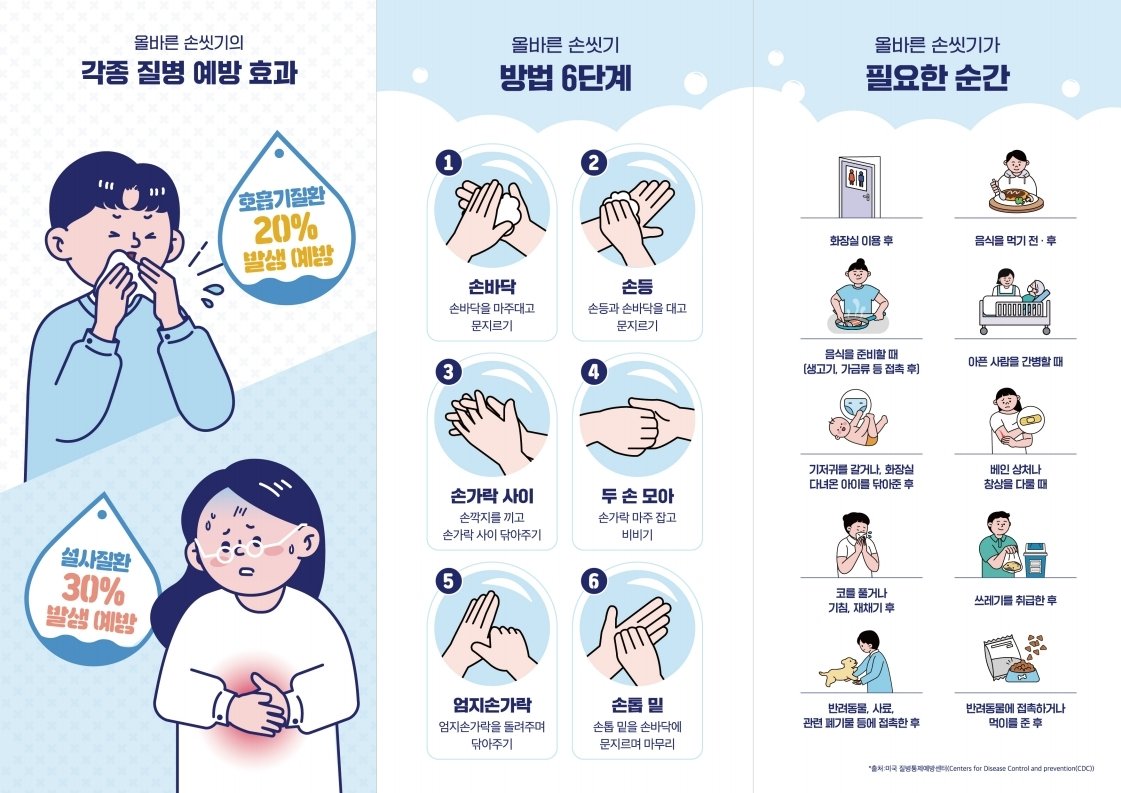 미국 질병예방통제센터(CDC)는 올바른 손 씻기가 코로나19, 독감(인플루엔자) 등 호흡기 감염병은 물론, A형간염과 같은 장관 감염병 예방에도 효과적이라며 특히 손 씻는 방법과 시기가 중요하다고 강조했다.