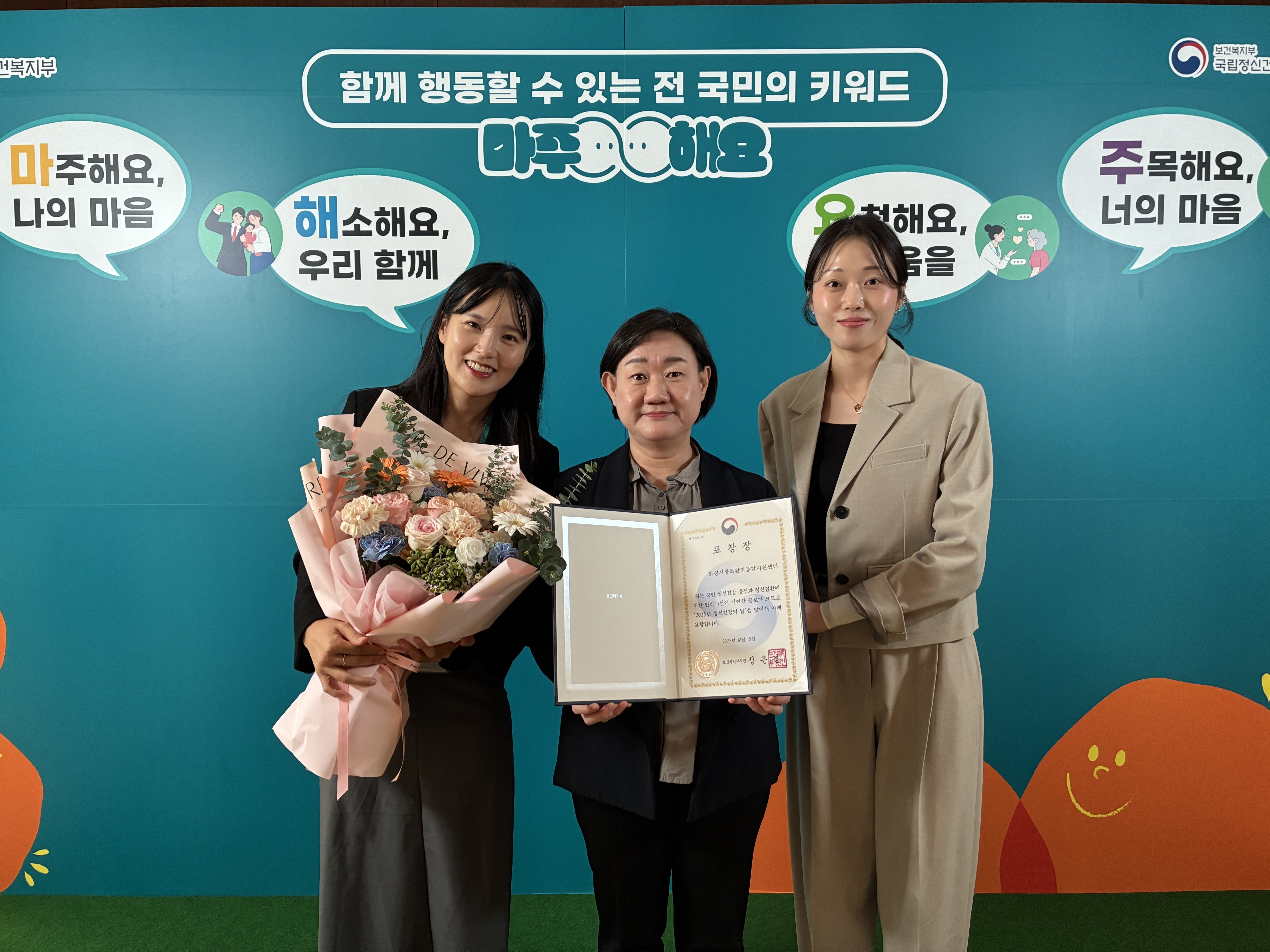 화성시중독관리통합지원센터가 15일 정신건강의 날 기념 보건복지부 장관 표창을 수상했다(사진 가운데 서은선 화성시중독관리통합지원센터장)