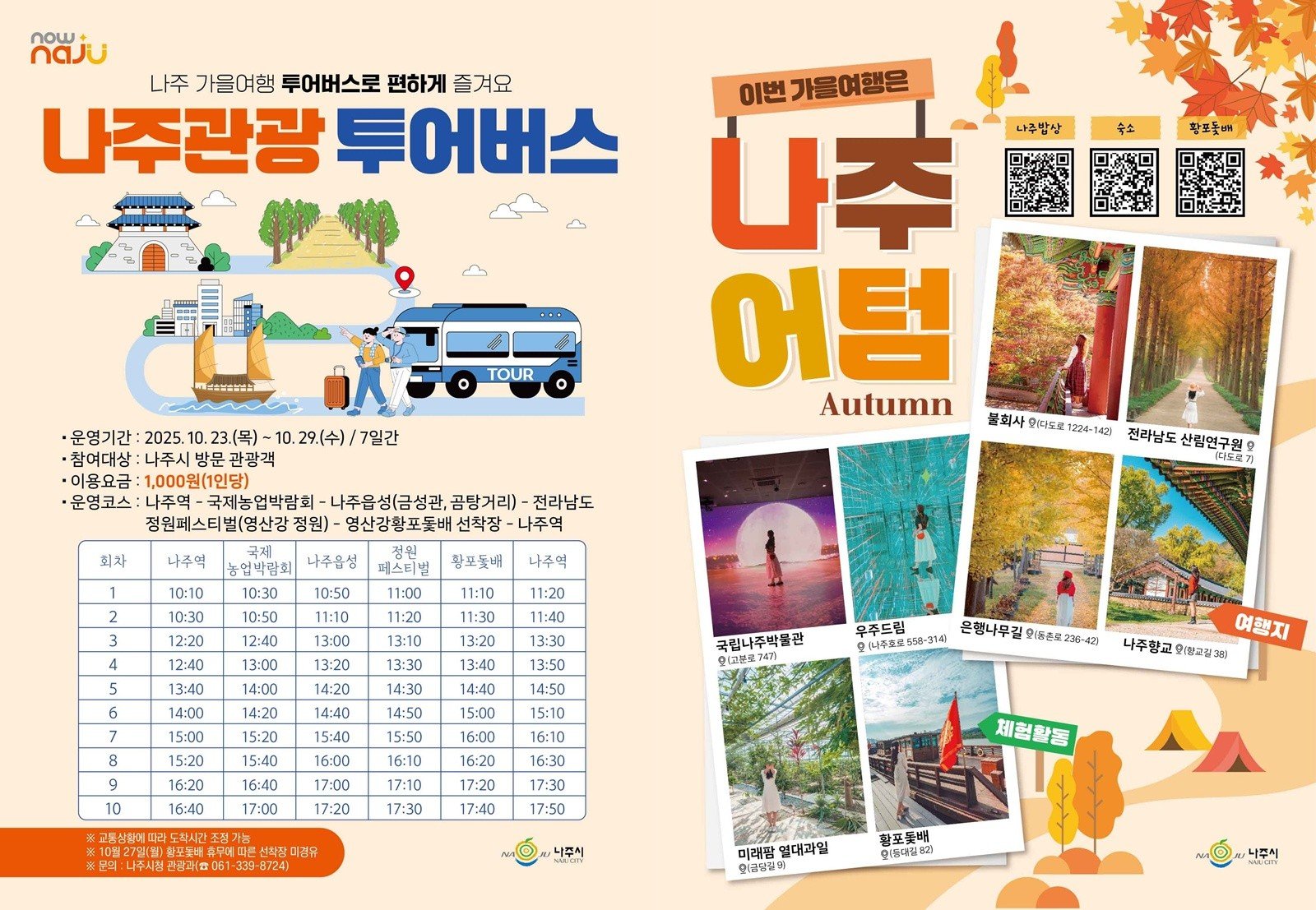 [금요저널] 전라남도 나주시(시장 윤병태)는 오는 10월 23일부터 29일까지 열리는 ‘2025 국제농업박람회’ 기간 동안 나주의 주요 관광지와 ‘2025 전라남도 정원페스티벌’ 이 열리는 영산강정원을 순환하는 ‘나주관광 투어버스’를 운영한다고 밝혔다.