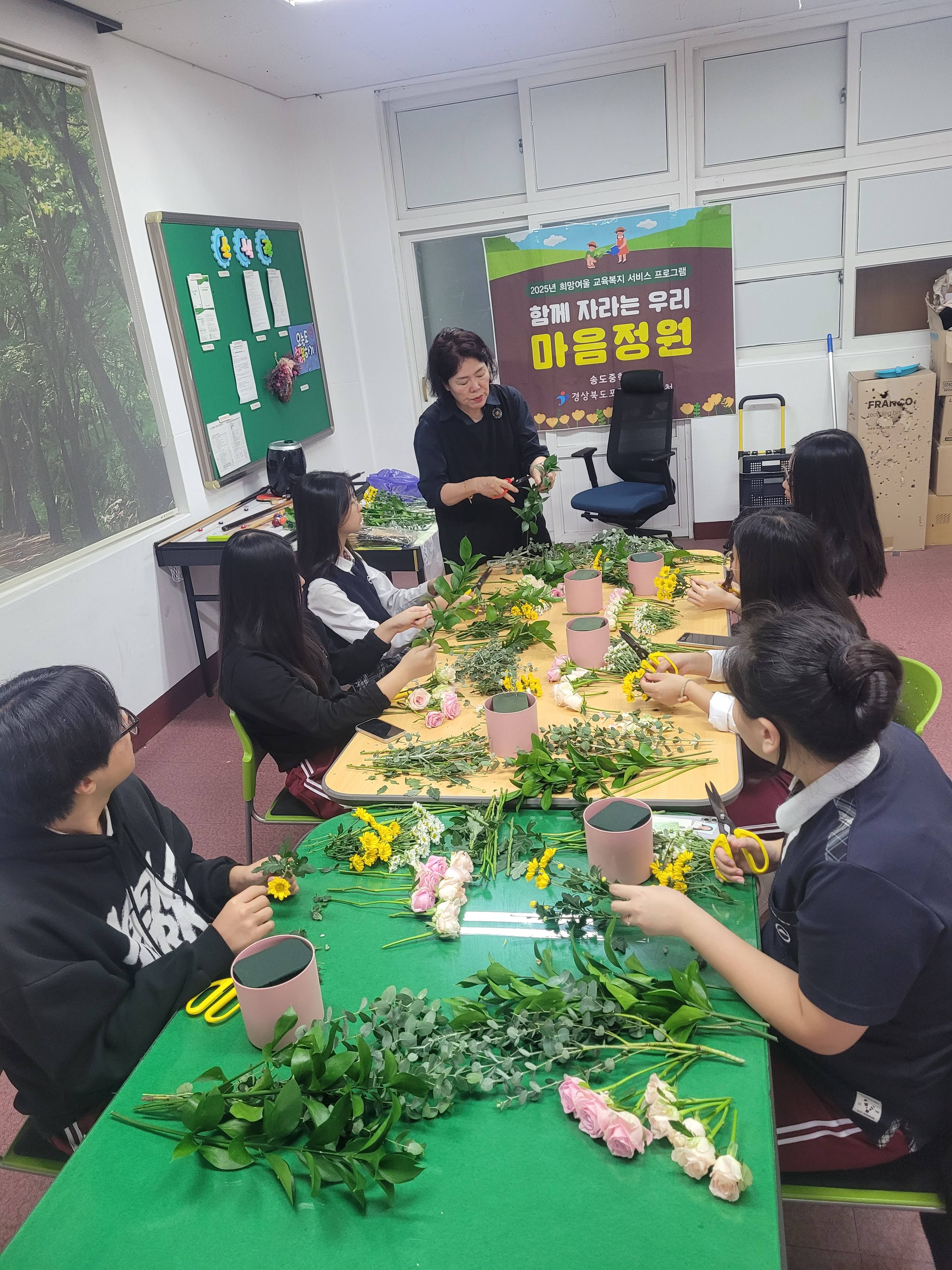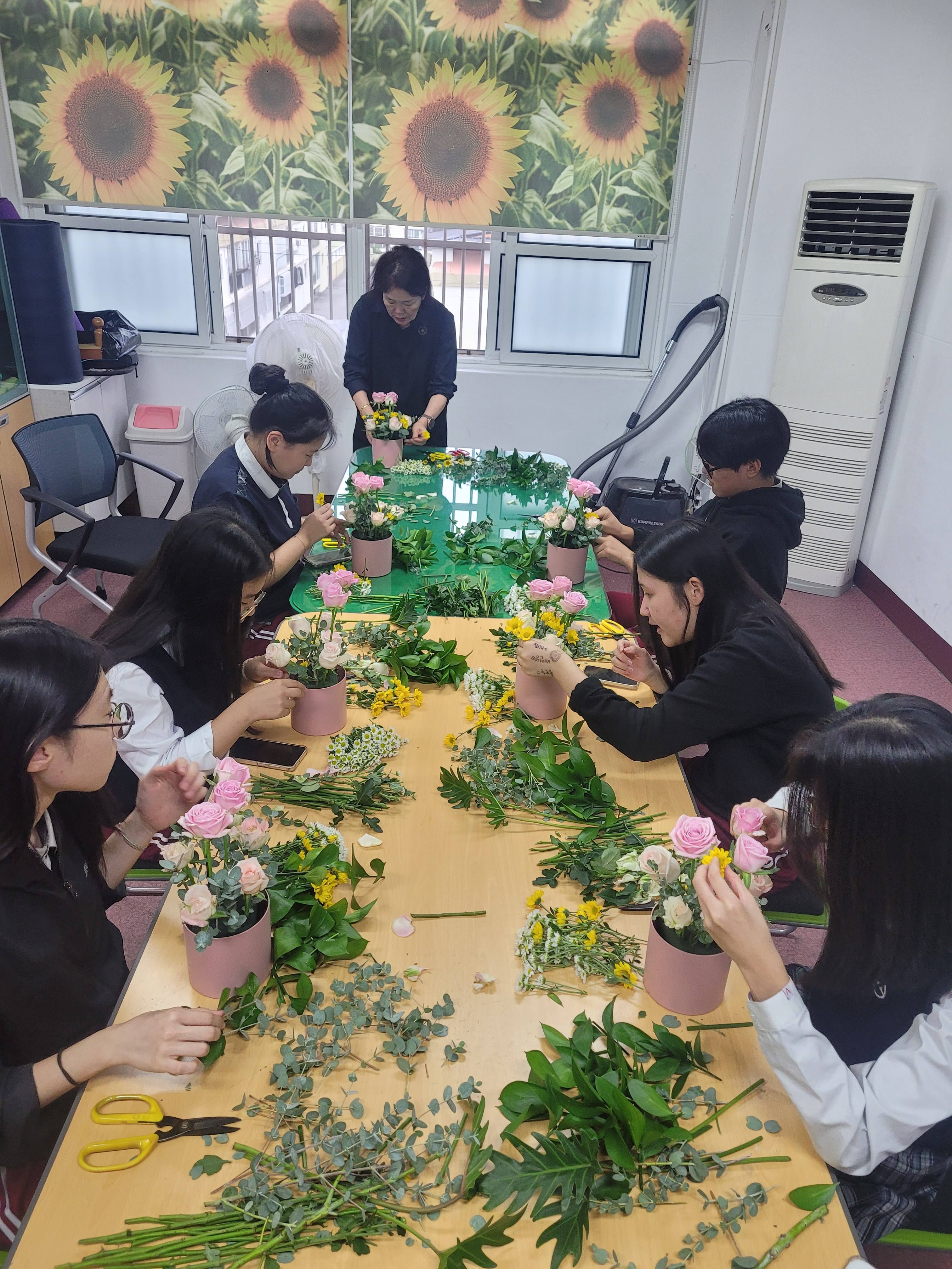 첫 회기에는 ‘긍정적 자아상 형성’을 위한 꽃장식 프로그램이 진행되었는데 학생들은 저마다의 개성을 담아 예쁜 꽃들을 꾸미며 즐거운 시간을 보냈다. 이날 프로그램에 참여한 3학년 박*서 학생은 “예쁜 꽃을 만들면서 제 마음도 환해지는 것 같고 친구들과 함께 이야기하며 꽃을 꾸미니 더 즐거웠다. 앞으로 남은 활동도 기대된다.”라며 환한 미소를 지었다.