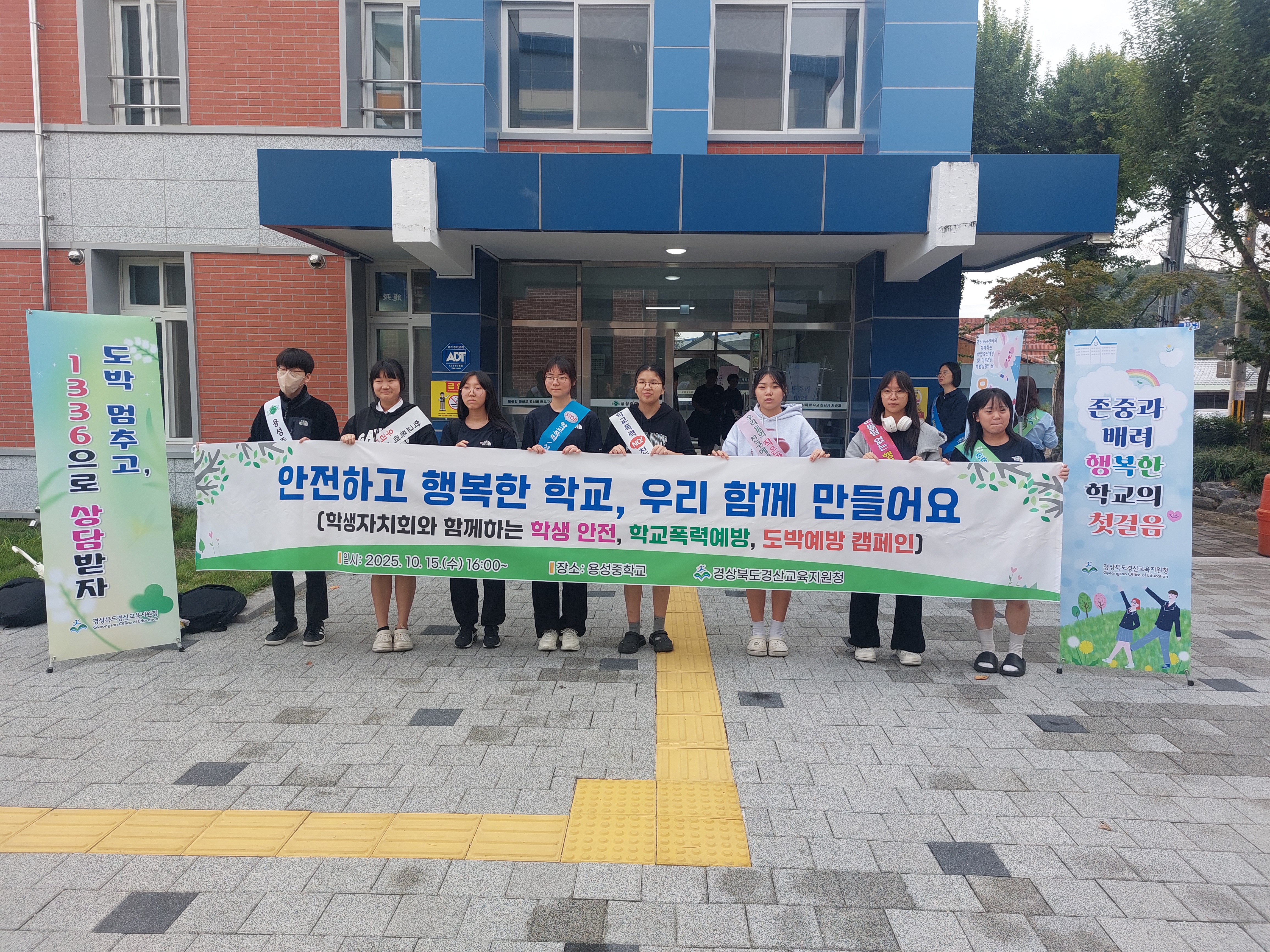 □ 경상북도경산교육지원청(교육장 정수권)은 10월 15일(수) 16시부터 용성중학교(교장 박정화) 정문에서 용성중학교 학생자치회 학생과 함께 “학교폭력예방, 도박예방 캠페인”을 실시하였다.