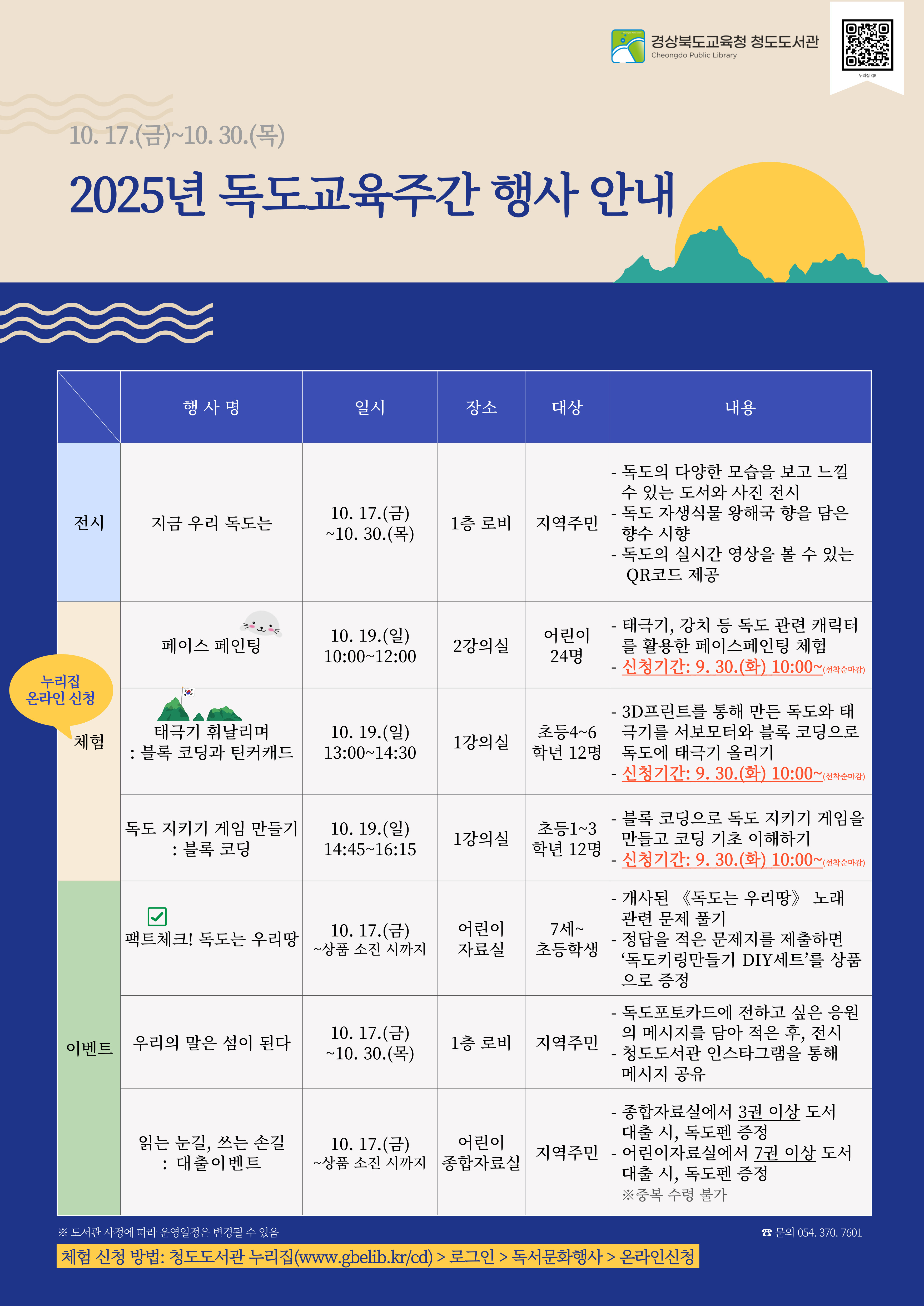 경상북도교육청 청도도서관(관장 조은희)은 오는 10월 17일부터 30일까지 지역 주민을 대상으로 「2025년 독도교육주간 행사」를 운영한다. 이번 행사는 전시와 체험 등의 행사를 통해 독도에 대한 올바른 역사적 이해와 인식을 돕고, 독도의 가치를 알리기 위해 마련되었다.