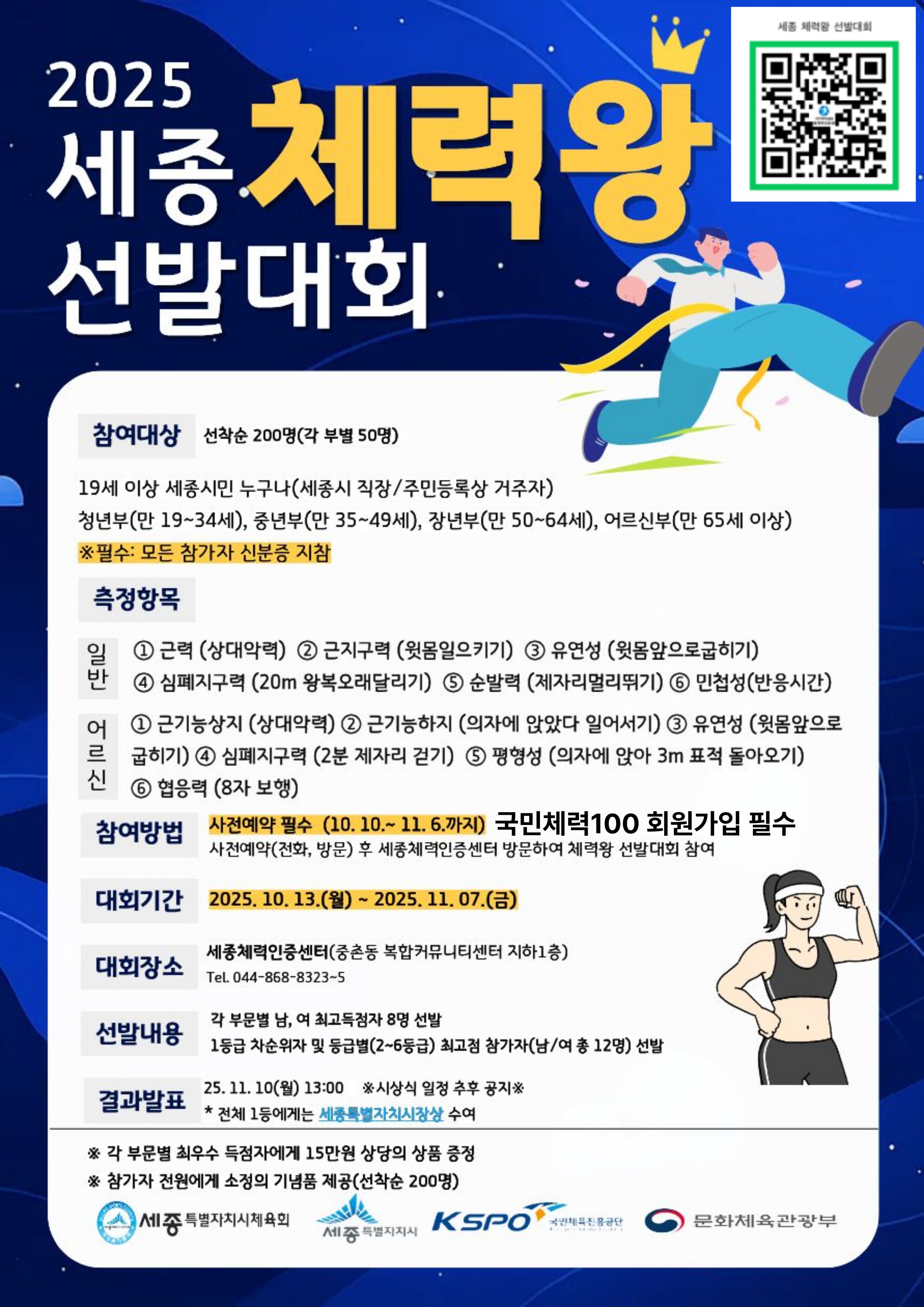 [금요저널] 세종시체육회(회장 오영철)는 시민의 건강증진과 생활체육 참여 확대를 위해 국민체육진흥공단 및 세종시의 재정 후원을 받아‘2025년 세종 체력왕 선발대회’를 오는 10월 13일부터 11월 7일까지 개최한다.