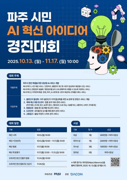 [금요저널] 파주시는 10월 13일부터 11월 17일까지 시민이 직접 참여하는 ‘파주 시민 인공지능 혁신 아이디어 경진대회’를 개최한다고 밝혔다.