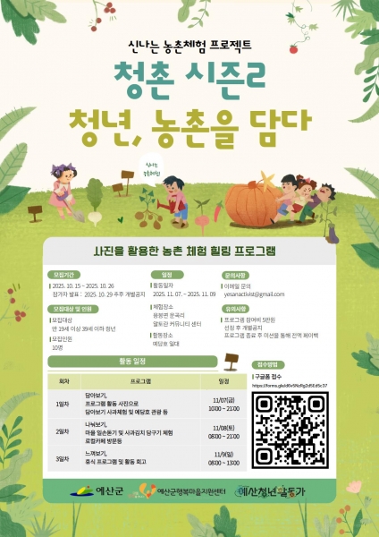 [금요저널] 예산군행복마을지원센터는 청년과 농촌이 함께 어우러지는 교류 프로그램 ‘청촌 시즌2’ 참가자를 오는 10월 26일까지 모집한다고 밝혔다.