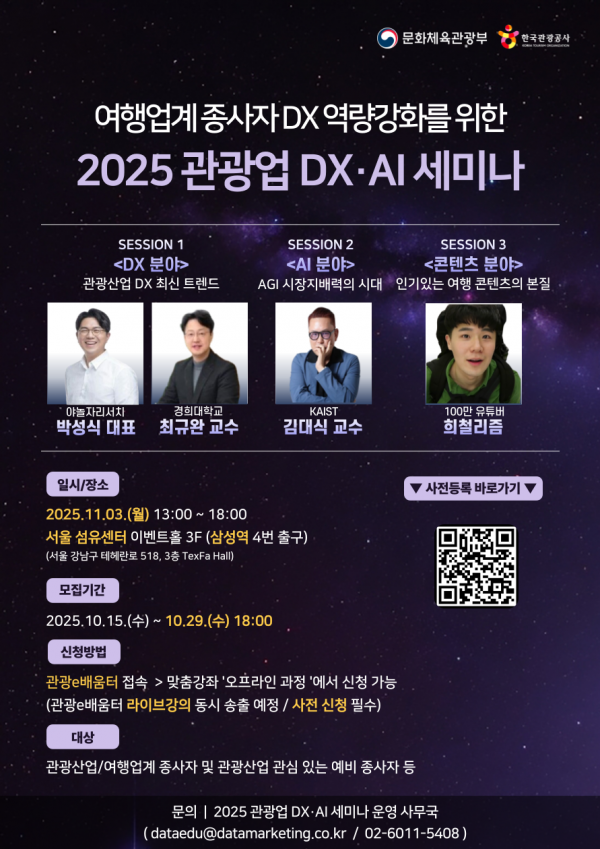 [금요저널] 문화체육관광부와 한국관광공사는 관광산업 종사자의 디지털전환, 인공지능과 연계한 역량 강화를 위해 11월 3일 서울 섬유센터 이벤트홀에서 ‘관광업 DX·AI 세미나’를 개최한다.