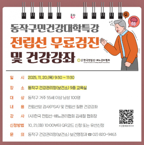 박일하 동작구청장은 “전립선질환은 조기 진단과 꾸준한 관리로 충분히 예방할 수 있는 만큼, 이번 특강이 건강한 노년을 준비하는 작은 출발점이 되길 바란다”며 “앞으로도 구민의 활력 있는 삶을 위해 실질적인 보건 서비스를 지속적으로 제공하겠다”고 말했다.