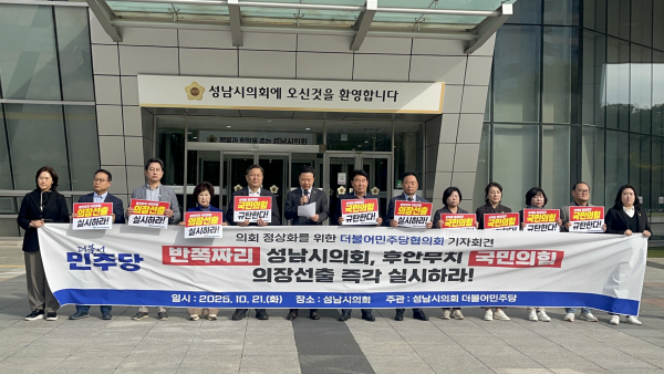 [금요저널] 성남시의회 더불어민주당협의회는 21일 시의회 정문에서 긴급 기자회견을 열고 “불법으로 멈춘 의회와 위법으로 흔들리는 행정을 바로 세우겠다”고 밝혔다.