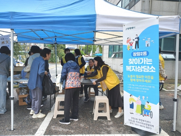 [금요저널] 고양특례시 일산동구 장항2동 지역사회보장협의체는 지난 18일 행정복지센터주차장에서 대화교회와 함께 지역사랑축제 바자회 및 찾아가는 복지상담소를 운영했다.