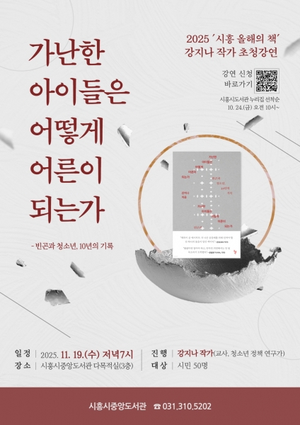 [금요저널] 시흥시 중앙도서관은 ‘2025년 시흥 올해의 책’ 으로 선정된 ‘가난한 아이들은 어떻게 어른이 되는가’의 저자 강지나 작가를 초청해 11월 19일 오후 7시 중앙도서관 3층 다목적실에서 시민 강연회를 개최한다.