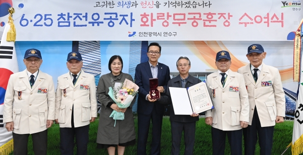 [금요저널] 연수구는 지난 21일 6·25전쟁에 참전해 공을 세운 故이장호 중사 유가족에게 화랑무공훈장과 증서를 전달했다.