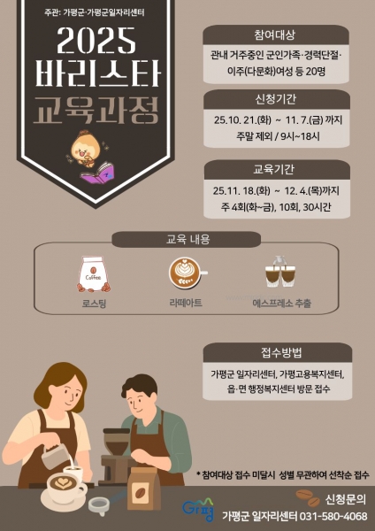가평군, ‘바리스타 자격과정’ 교육생 모집
