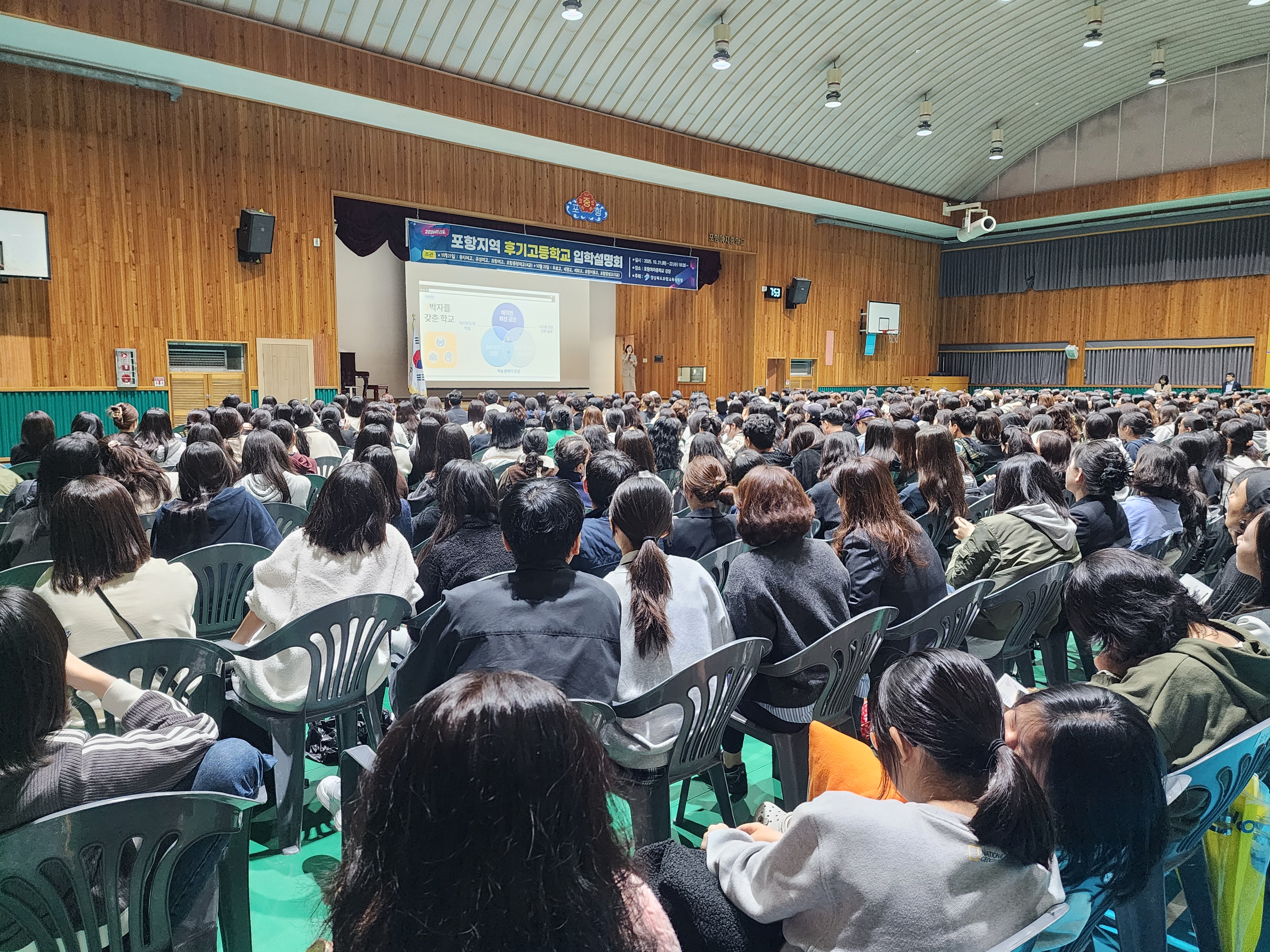 포항교육지원청(교육장 최한용)은 10월 21일(화) 18:30~20:10, 포항여자중학교 강당에서 고교학점제 소개 및 후기여자고등학교 입학설명회를 개최하였다. 본 설명회는 포항지역 중학교 3학년 학생 및 학부모님을 대상으로 개최하였으며, 효율적인 후기고등학교 입학정보 제공으로 진로와 진학 선택에 도움을 주기 위한 목적이다.
