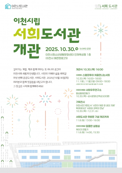 이천시 여섯 번째 공공도서관인 서희도서관 개관을 기념해 스탬프 투어, 체험행사, 기획 전시 등 다채로운 행사가 진행될 예정이며 시민들이 도서관과 더 가까워지는 특별한 경험이 될 것으로 기대된다.