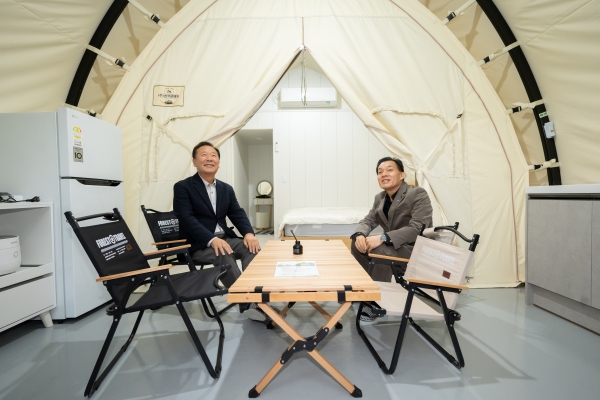 이재준 수원시장(오른쪽)과 박현국 봉화군수가 글램핑 시설을 살펴보고 있다.