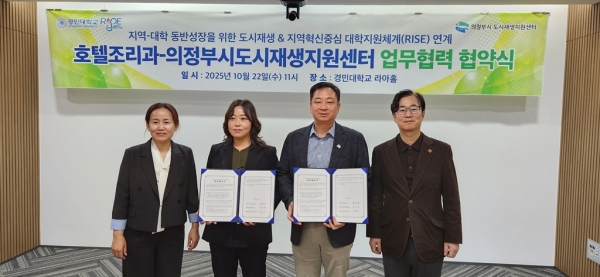 [금요저널] 의정부시 도시재생지원센터는 10월 22일 경민대학교와 ‘의정부동 구도심 상권 재생사업’의 성공적 추진을 위한 업무협약을 체결했다.